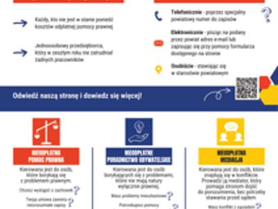 Znajdziesz tam profesjonalną i darmową pomoc radców prawnych, adwokatów, mediatorów oraz osób zajmujących się poradnictwem obywatelskim. Pomoc świadczona jest na podstawie: ustawy z dnia 5 sierpnia 2015 o nieodpłatnej pomocy prawnej,nieodpłatnym poradnictwie obywatelskim oraz edukacji prawnej.