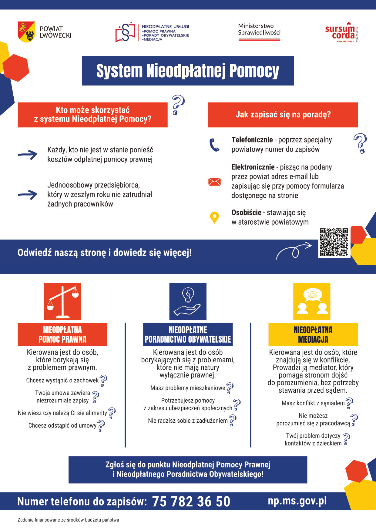 Szukasz pomocy lub wsparcia prawnego w trudnej sprawie? Nie stać Cię na skorzystanie z usług kancelarii prawnej i nie masz się do kogo zwrócić o pomoc? Zapraszamy do korzystania z punktów nieodpłatnej pomocy prawnej i poradnictwa obywatelskiego na terenie Powiatu Lwóweckiego.