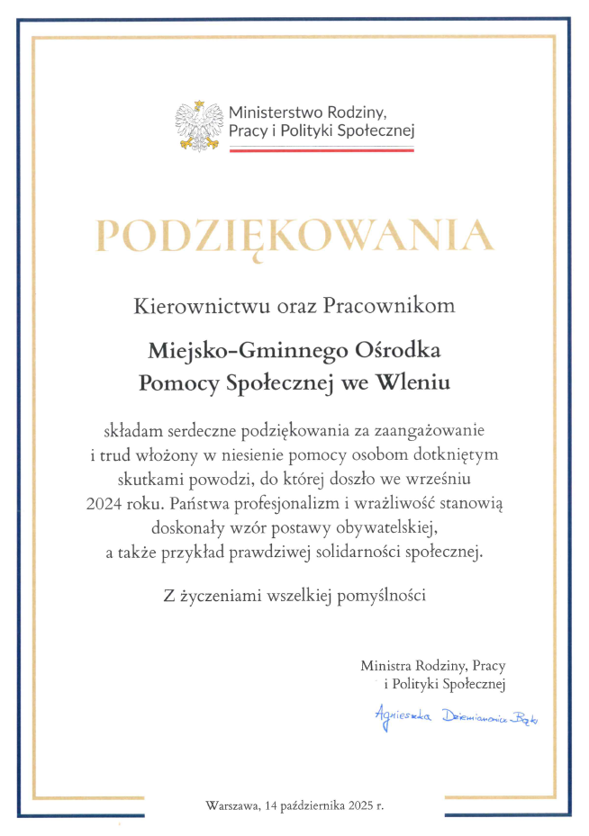 14 października 2025 roku na zaproszenie ministry rodziny, pracy i polityki społecznej Agnieszki Dziemianowicz-Bąk Warszawę odwiedzili przedstawiciele kilkudziesięciu jednostek takich jak ośrodki pomocy społecznej, których pracownicy z oddaniem nieśli pomoc osobom poszkodowanym w ubiegłorocznej powodzi. Część z nich delegowana była do pracy poza swoim miejscem zamieszkania, by wspomóc koleżanki i kolegów z innych województw w tym szczególnym czasie.