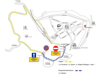 Dojazd do cmentarzy komunalnych będzie możliwy przez miejscowość Łupki. Ulica Górska przekształcona zostanie w drogę jednokierunkową, która umożliwi zjazd w kierunku miasta. Poniżej prezentujemy mapkę poglądową. Prosimy o zachowanie ostrożności oraz życzymy bezpiecznego dojazdu do celu.
