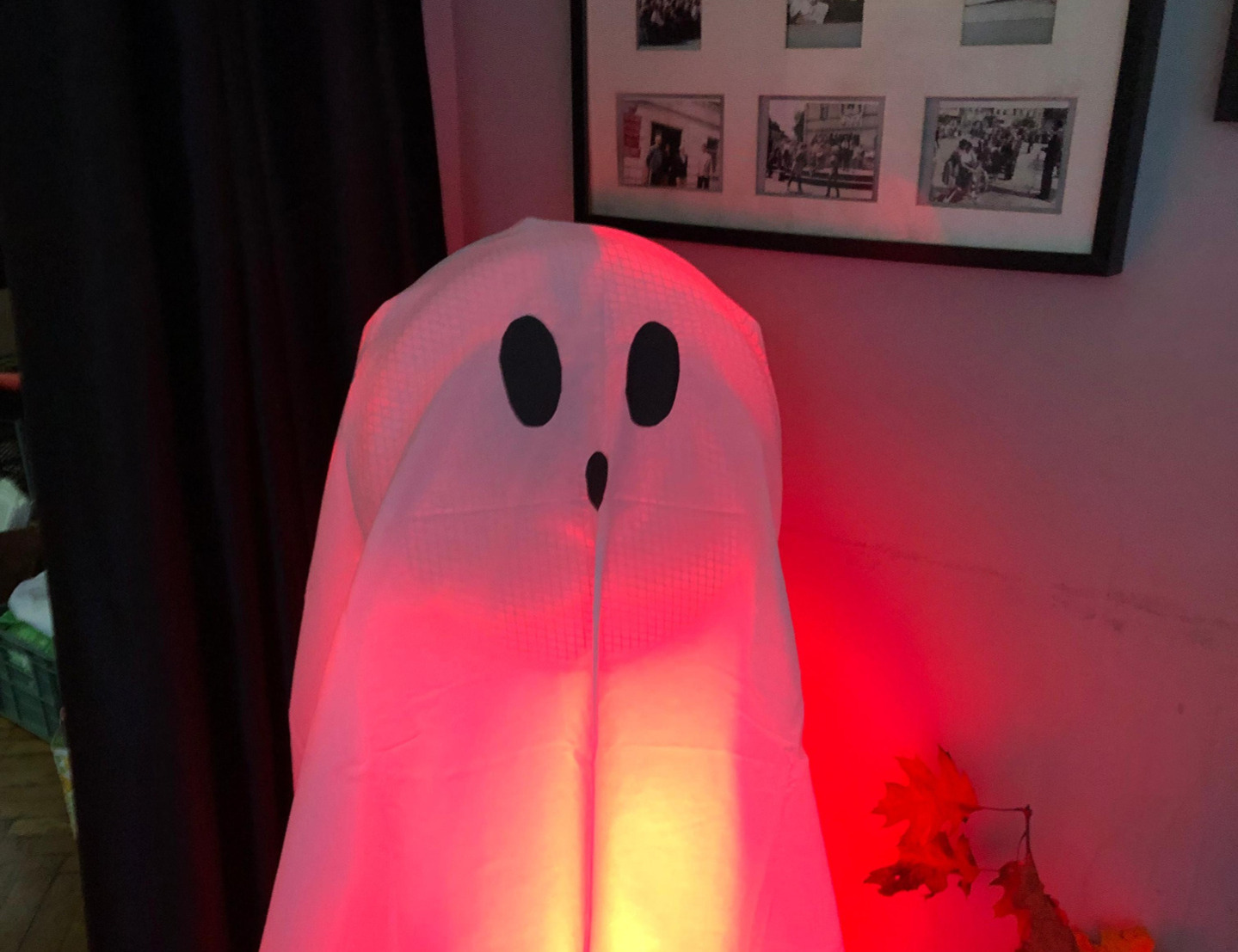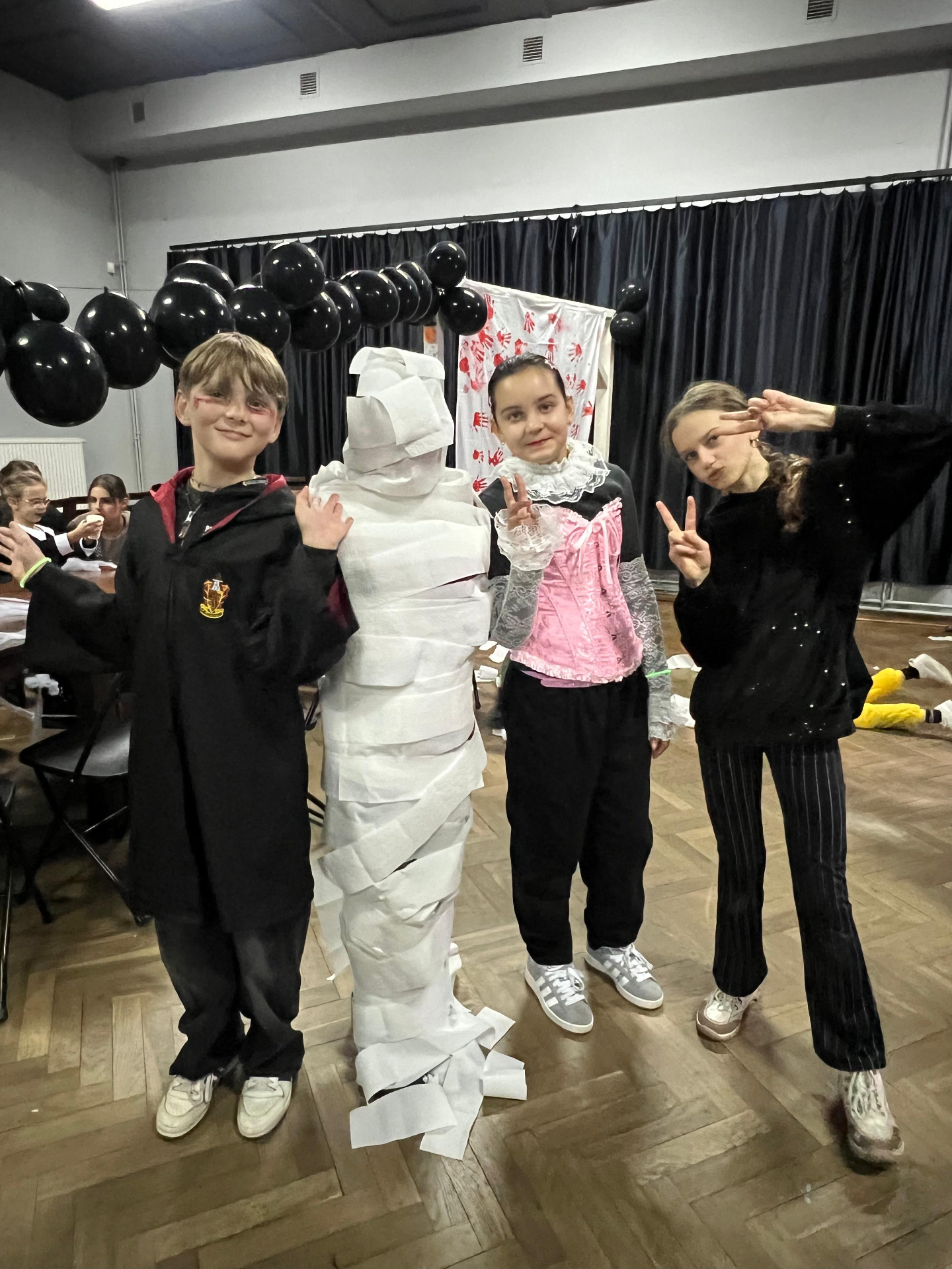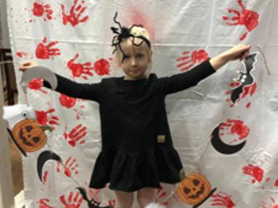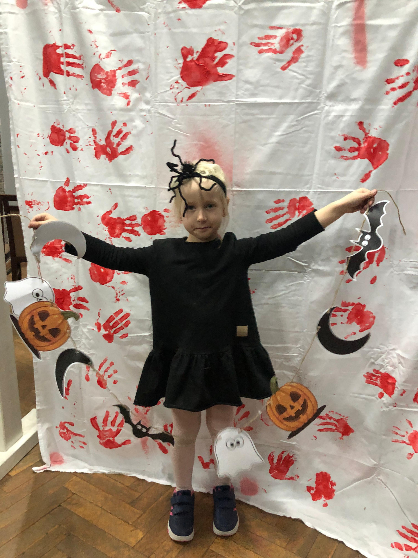 Stworzona została niezwykła ścianka do zdjęć – dzieci odbijały swoje rączki czerwoną farbą na prześcieradle, które zamieniło się w tło pełne pamiątkowych śladów i zawisło na naszych „czarodziejskich drzwiach”, tworząc prawdziwie halloweenową scenografię.