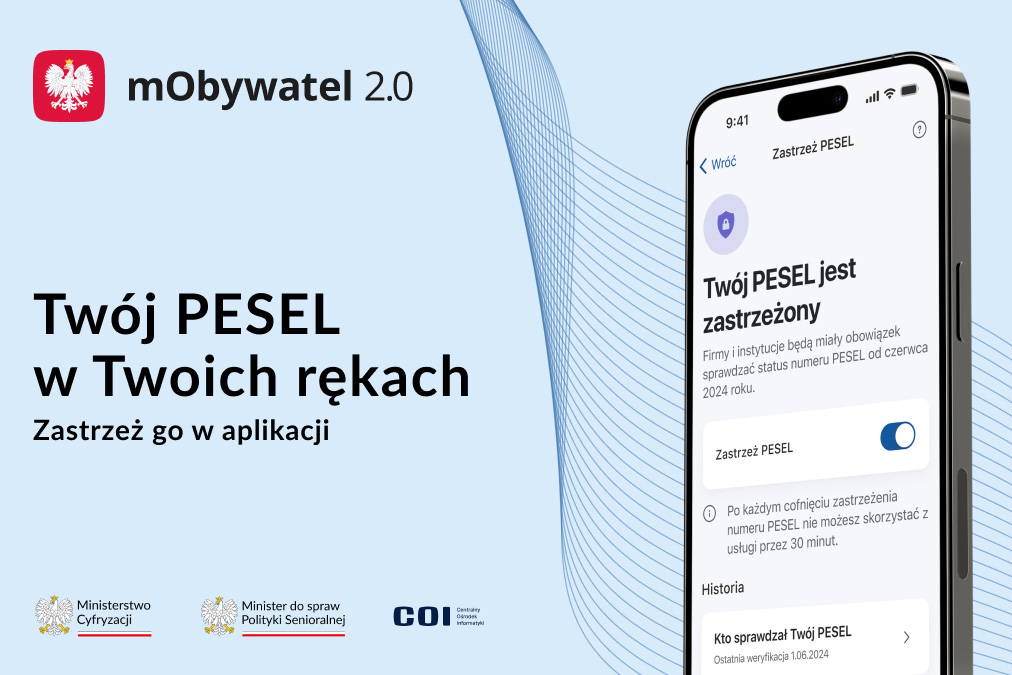 Liczba prób wyłudzeń kredytów na cudze dane rośnie. Ministerstwo Cyfryzacji wprowadziło więc do aplikacji mObywatel 2.0 usługę Zastrzeż PESEL. Dzięki niej użytkownik może zastrzec swój numer PESEL, cofnąć zastrzeżenie i ponownie je ustawić. Widzi też, jakie firmy i instytucje sprawdzały jego numer PESEL i z jakiego powodu. Od 1 czerwca 2024 instytucje finansowe będą miały obowiązek sprawdzenia statusu numeru PESEL np. przed udzieleniem pożyczki.