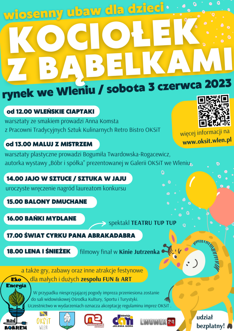W sobotę 3 czerwca 2023 zapraszamy na wleński rynek wszystkich chętnych dziecięcych wrażeń, starszych i młodszych, głodnych niecodziennych przygód, którymi smutkom i nudzie mówi stanowcze nie! Przygotowaliśmy szereg ciekawych warsztatów twórczych, spotkań ze sztuką i zabaw.