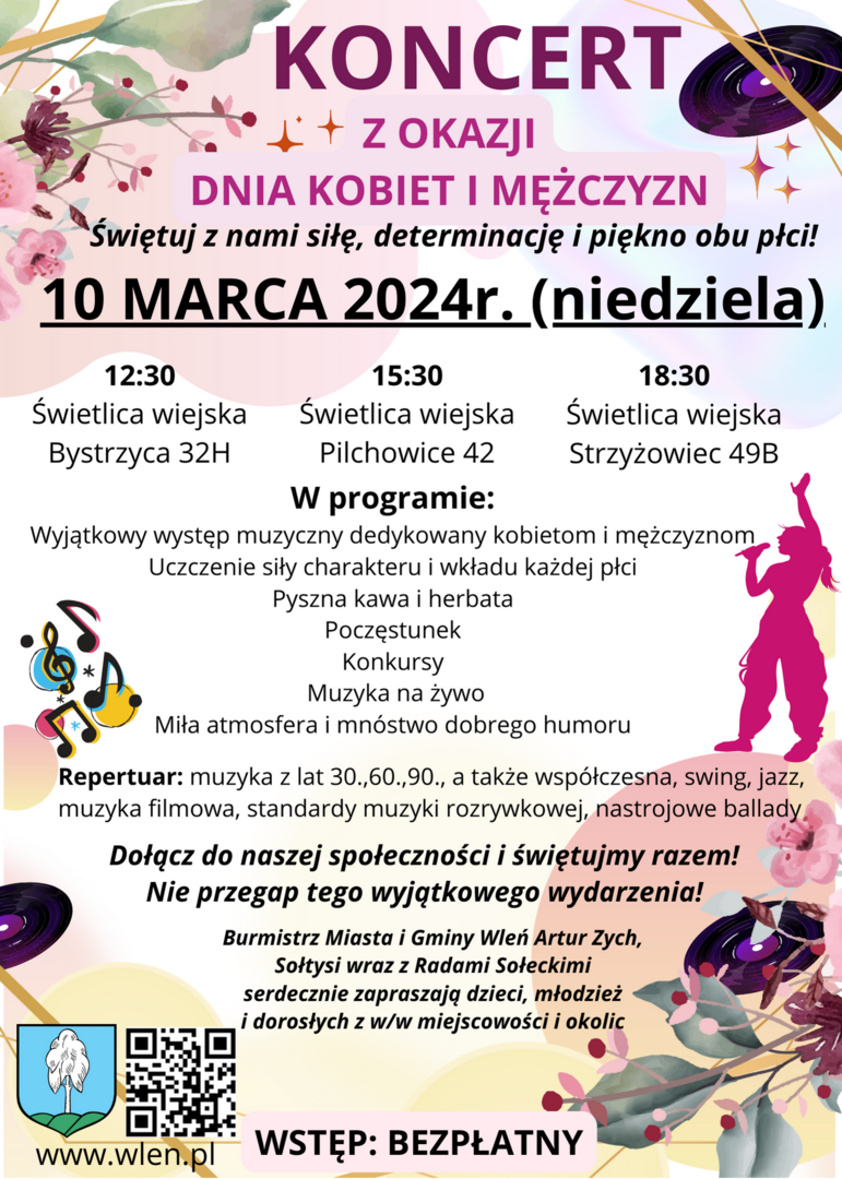 Burmistrz Miasta i Gminy Wleń Artur Zych, Sołtysi wraz z Radami Sołeckimi Bystrzycy, Pilchowic i Strzyżowca serdecznie zapraszają wszystkie dzieci, młodzież oraz dorosłych z wyżej wymienionych miejscowości i okolic na spotkanie z muzyką, z okazji obchodówDnia Kobiet i Mężczyzn!